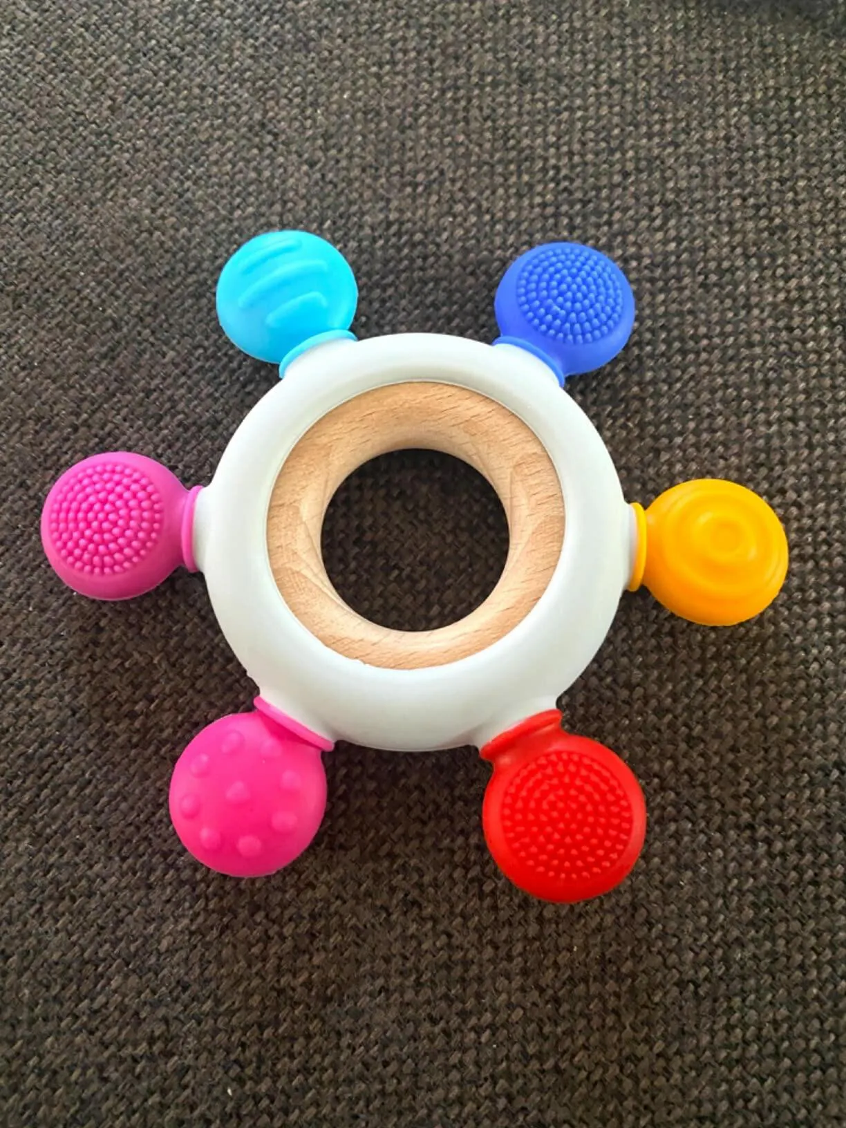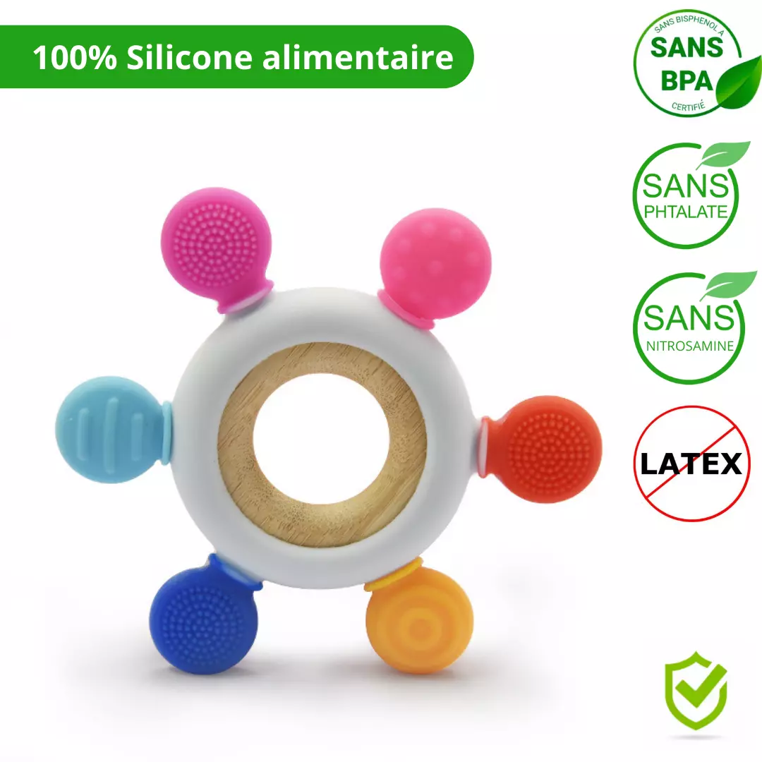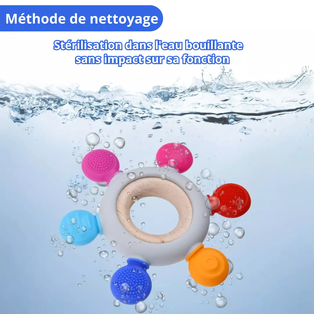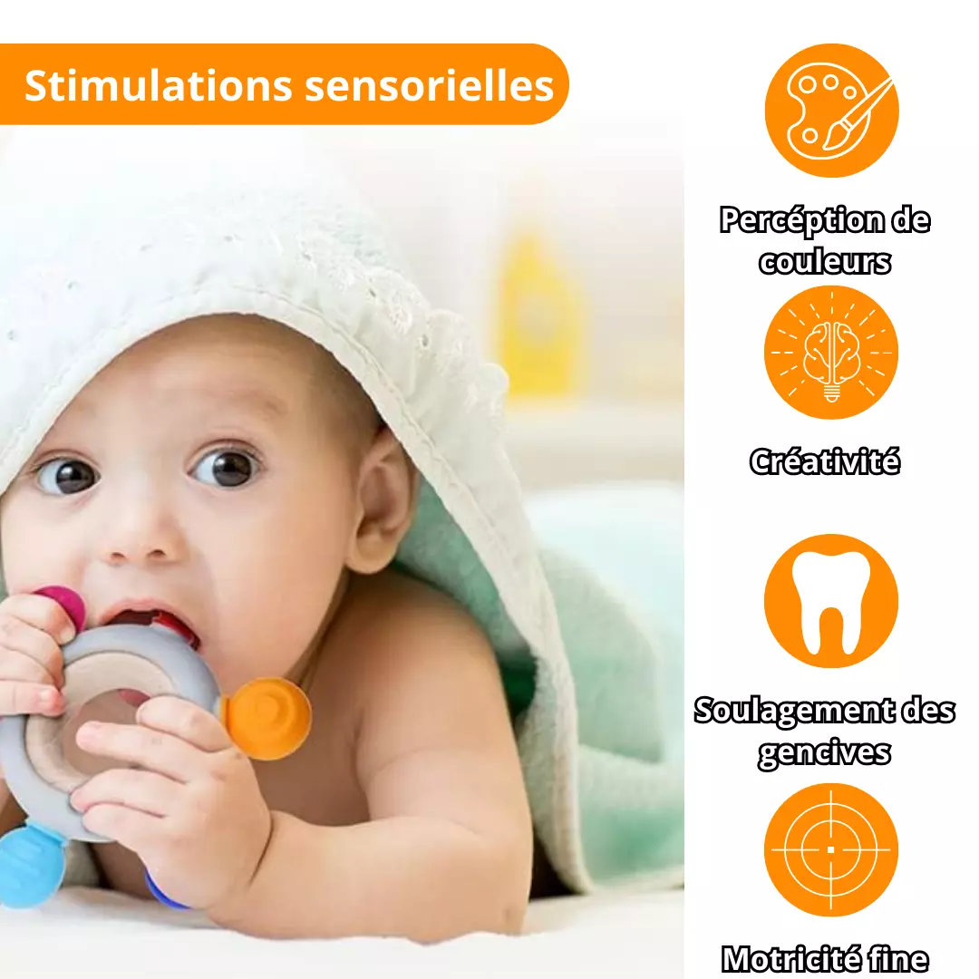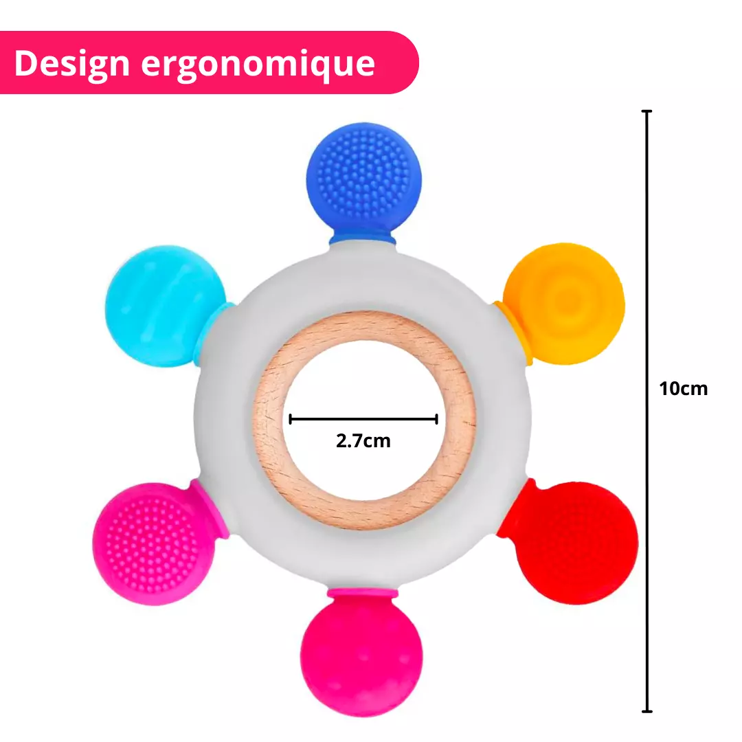 💫 Soulagement optimal : Grâce à sa forme ergonomique et à ses multiples textures, notre anneau de dentition offre un soulagement instantané à votre bébé. Les surfaces douces et élastiques massent délicatement les gencives, apaisant les douleurs liées à la poussée dentaire.